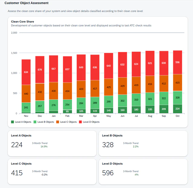 Die Verteilung von Kundenobjekten über die verschiedenen Clean-Core-Level. Bis so ein hübsches Dashboard alles anzeigt, gibt es wie immer einige Sternchen und Fußnoten, die noch an Vorarbeit erledigt werden wollen.