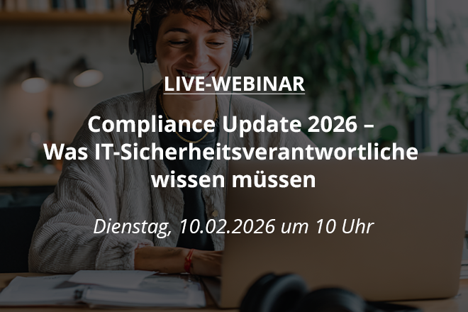 In diesem Webinar erhalten Sie einen kompakten Überblick über die wichtigsten Compliance-Themen 2026 rund um IT-Sicherheit – u. a. CRA, NIS-2, EU AI Act und DORA. Anhand von Best Practices und Kundenbeispielen zeigen wir, worauf es bei der Umsetzung ankommt und welche Fallstricke Sie vermeiden sollten.