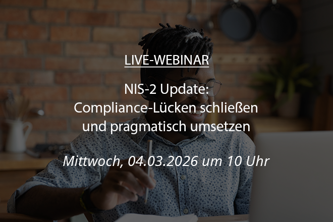 NIS-2 ist seit 06.12.2025 in Kraft – jetzt kommt es auf konkrete Umsetzung an. In unserem Webinar zeigen wir, wie Sie Compliance-Lücken schnell schließen und NIS-2 pragmatisch angehen – mit klaren Schritten und Praxisbeispielen.